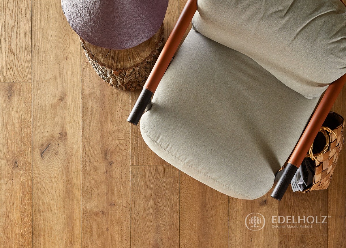 Die nahezu astfreie Oberfläche unserer edelsten Sortierung strahlt Eleganz und Ruhe aus. Die dezente Maserung und das einheitliche Farbbild verstärken diesen Effekt noch zusätzlich und machen sie zum Favoriten insbesondere bei EDELHOLZ Fischgrät- und Chevron-Parkettböden.