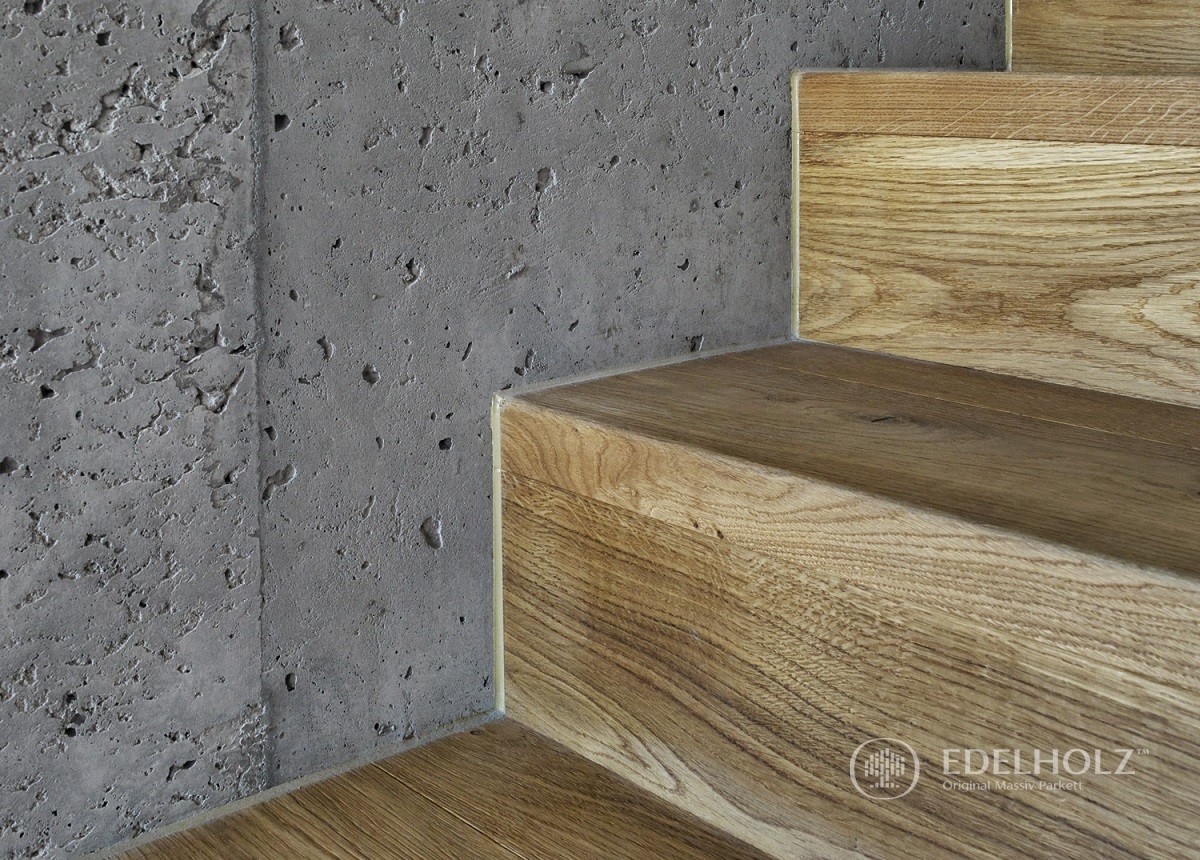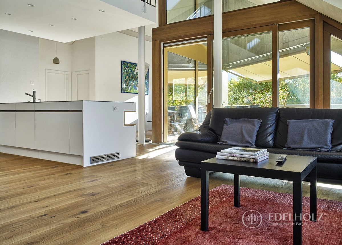 Die Oberfläche der Natural Wave 1000 Diele ist wie das Wasser eines Sees, das von der Sommerbrise geblasen wird. Die Empfindlichkeit des Holzbodens, die die Erfahrung der Taktilität bietet, wird besonders gut in diesem betonbeschichteten Haus betont, da die Oberfläche durch das zarte Gefühl der Dielen, die von unseren Tischlermeistern von Hand gehobelt wurden, perfekt ausgeglichen werden. Dank dieser besonderen und traditionellen Arbeitsweise entstehen niemals zwei identische Holzbodendielen. Dies gilt insbesondere dann, wenn Sie sich für eine Natural Wave Diele in rustikaler Auswahl entscheiden. Eine weitere Besonderheit des Projekts ist die Treppe mit moderner Geometrie, die sich perfekt in das Design des Holzbodens einfügt und auch in rustikaler Auswahl gestaltet ist.