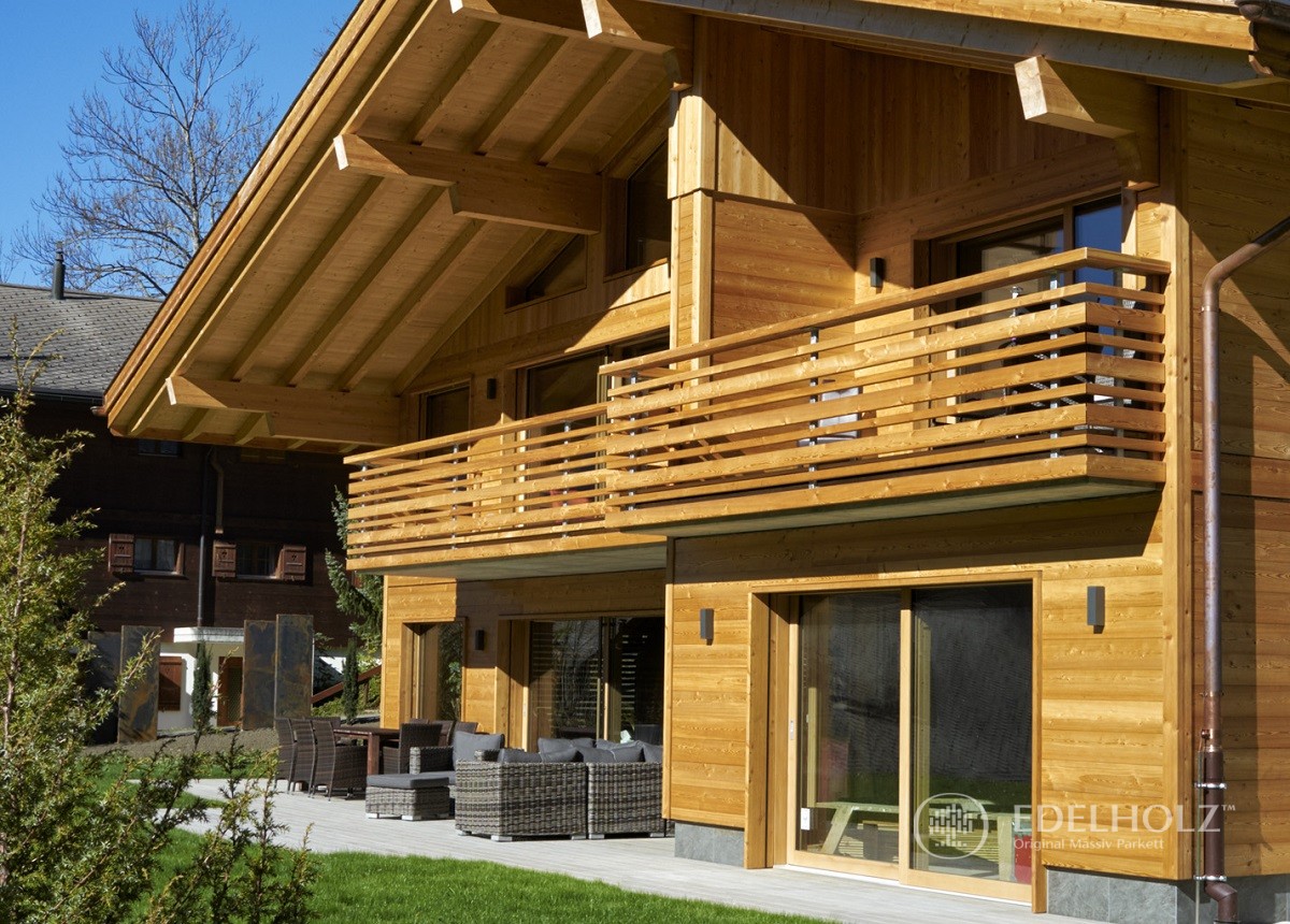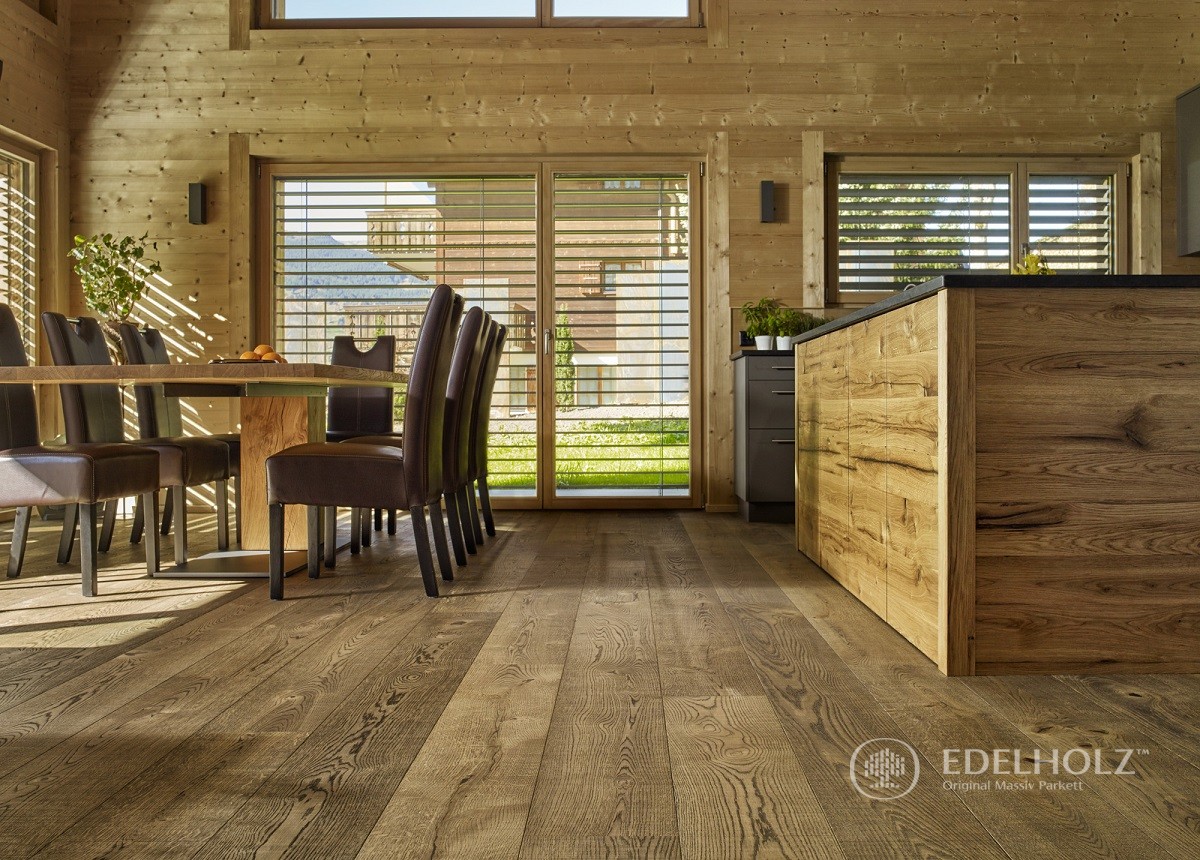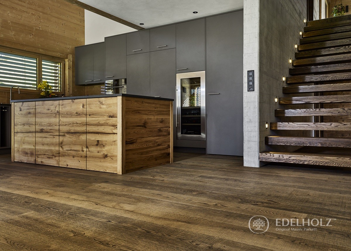 Unser Origin 1800 Holzparkett wurde in jedem Sinne in eine faszinierende Umgebung gebracht, da dieses Chalet in den Schweizer Alpen auch im Inneren an die mystische Verbindung von felsigen Bergen und Wäldern erinnert. Das einzigartige Ambiente der vom Kunden ausgewählten, besonders breiten Dielen und Betonoberflächen wird durch die sägeraue, industriell aussehende Oberflächenstruktur der Origin 1800 verstärkt, die durch eine tiefe, braunölige Oberflächenbehandlung ergänzt wird. Ein weiteres Element des Hauses, das für uns etwas Besonderes ist, ist neben dem Holzboden die schwebende Treppe, die ebenfalls mit einer Origin 1800-Oberflächenstruktur versehen ist. Dank diesem einheitlichen Design funktioniert die Treppe so, als ob die Dielen im Raum schweben würden.