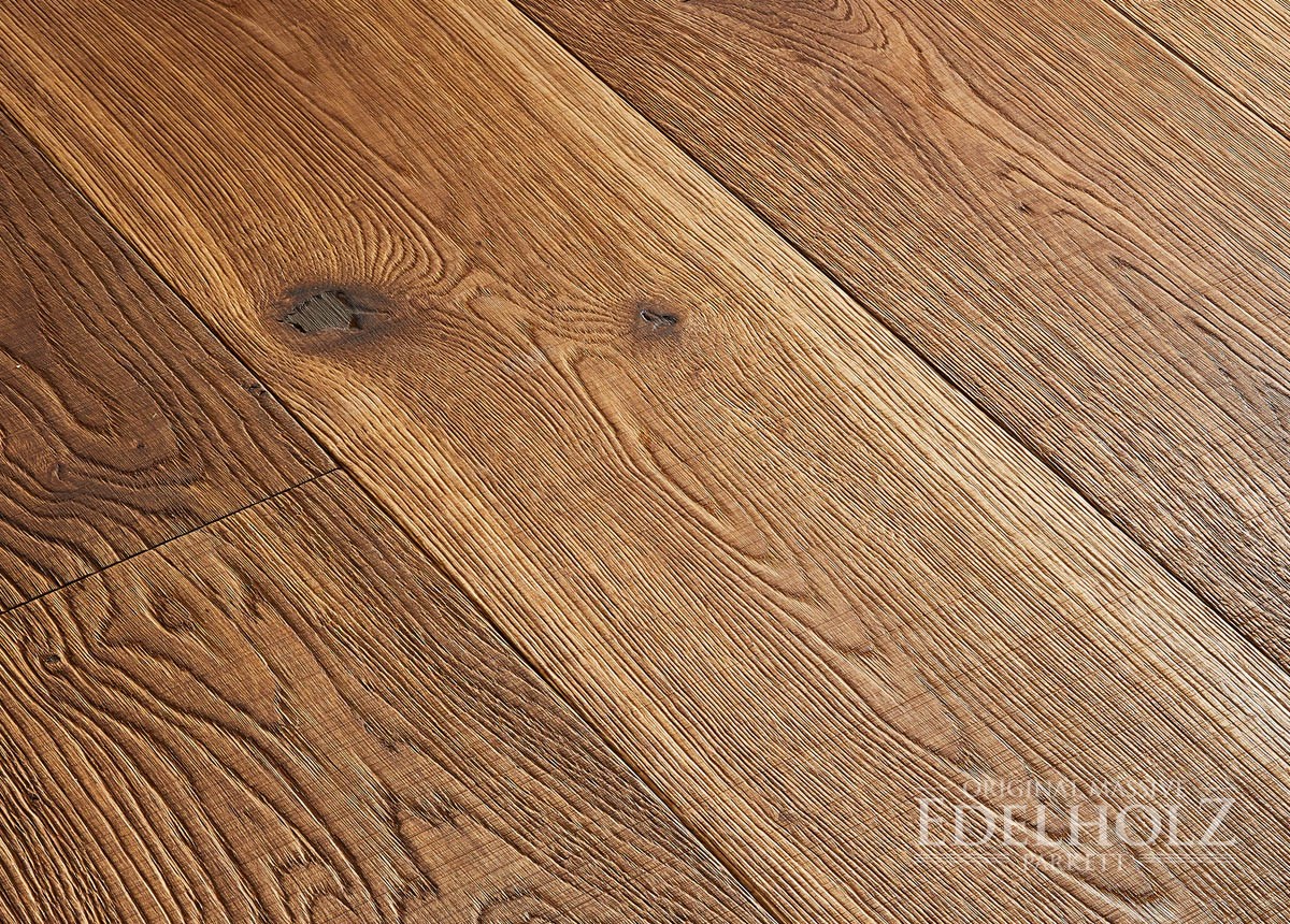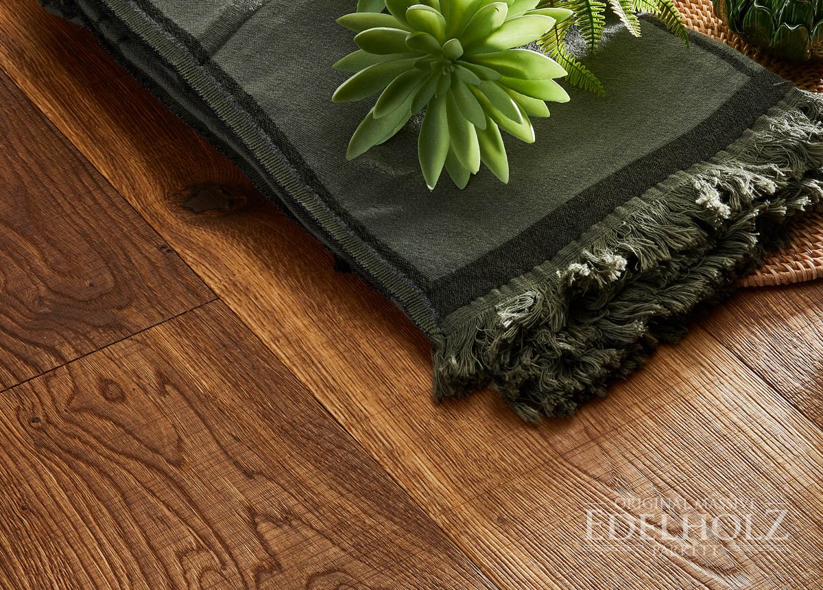 Eine sehr beliebte Sortierung, die durch natürliche Lebendigkeit mit charakterstarken Ästen und Rissen besticht, was besonders bei unseren großformatigen Eichendielen ein spannendes Oberflächenbild erzeugt. Sorgfältig gekittete kleine bis größere Äste und vereinzelte wenige Splintanteile sorgen im Zusammenspiel mit markanten Holzstrukturen und einem lebhaften Farbspiel für einen Facettenreichtum, der von EDELHOLZ-Kunden sehr geschätzt wird.