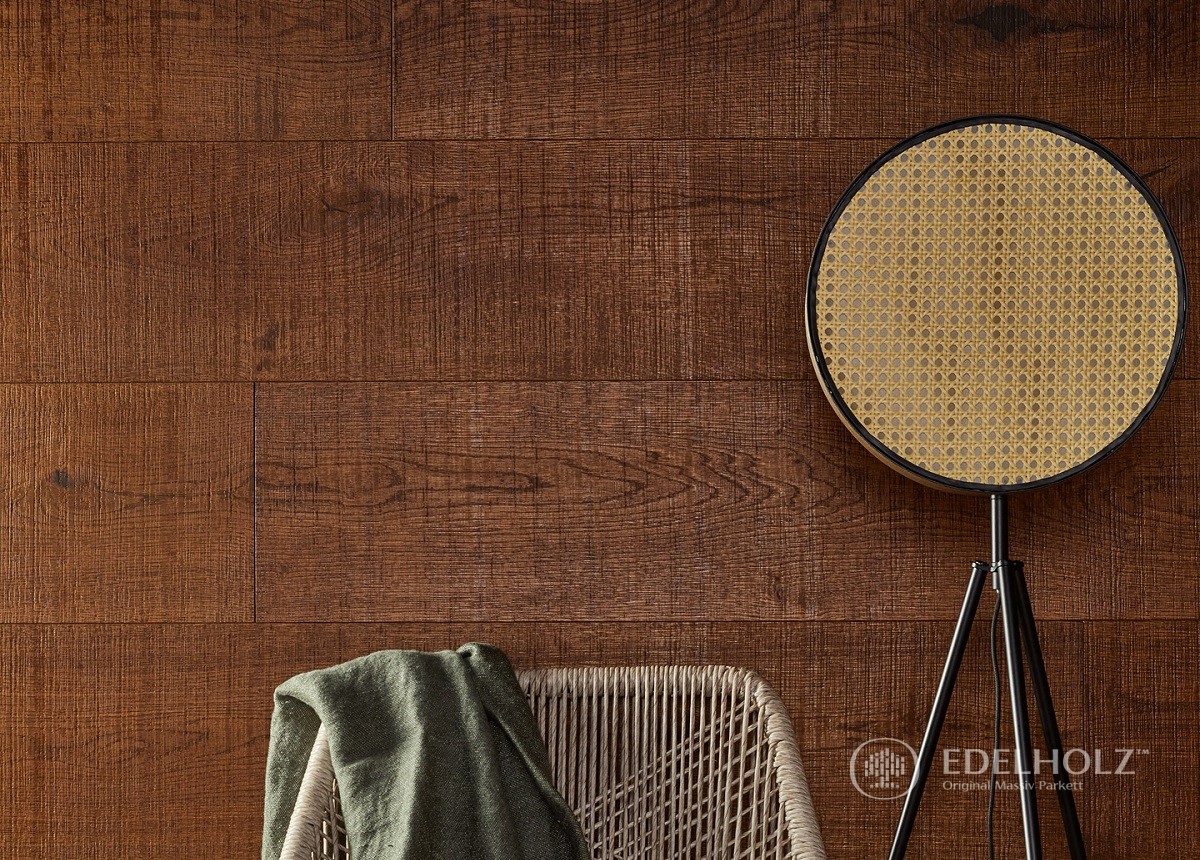Diese sägeraue, geflammte Wandverkleidung wird nussbaum geölt.