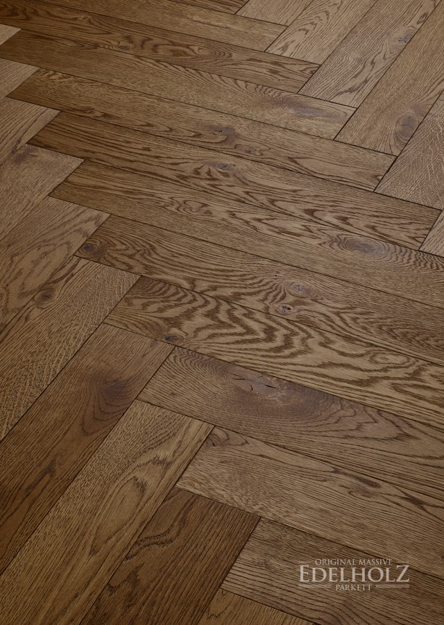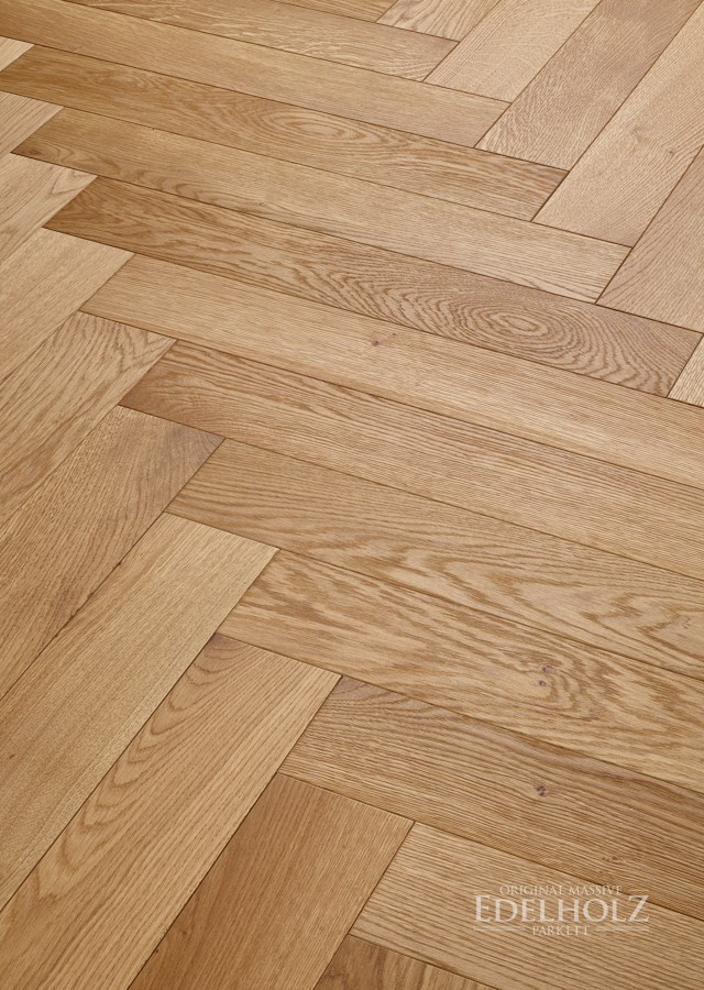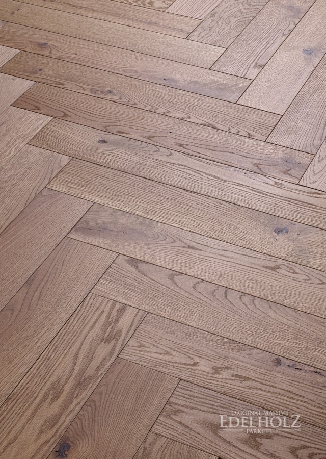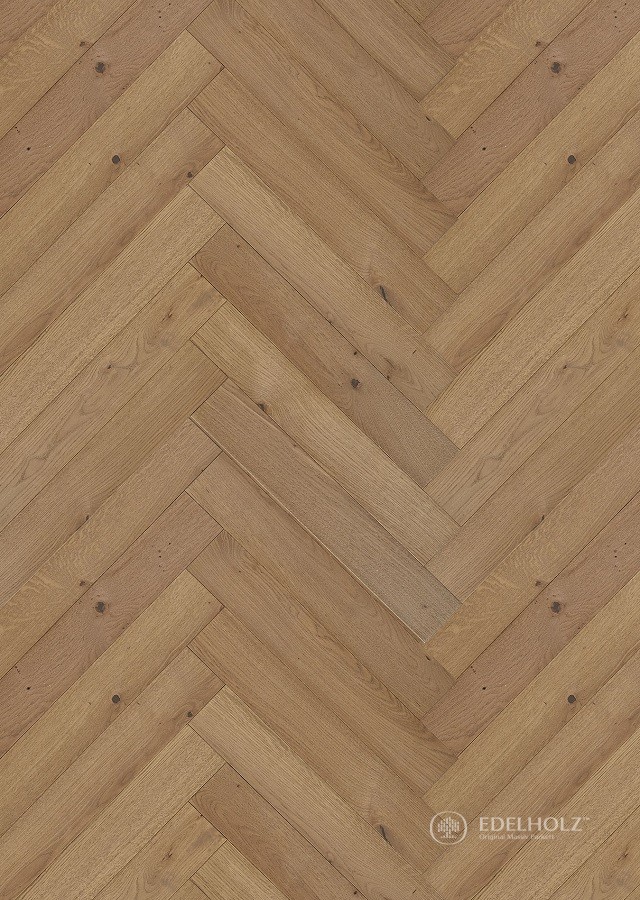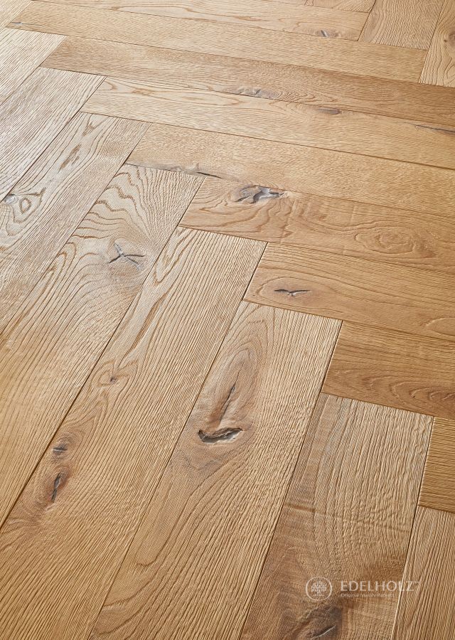 Die großen Stäbe von EDELHOLZ Fischgrät unterscheiden sich völlig von den kleinen Stäben der alten Zeiten. Das hochqualitative, elegante Chevron Parkett wirkt größer als üblich, deshalb erweitert es den Raum und sorgt für eine großartige Erscheinung. Die zahlreichen Fischgrätmuster und die verschiedenen Oberflächen verleihen dem Eichenboden einen individuellen Charme. Im Angebot von EDELHOLZ finden Sie sowohl rustikale, leicht gealterte, als auch moderne, fein ausgeführte Fischgrätparkette mit großen Stäben.