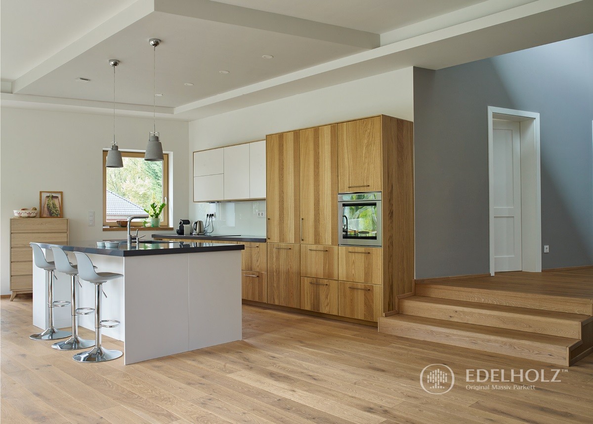 Es ist die Harmonie zwischen Dielen und der Innentreppe, die das klare und schnörkellose, in modernem Styl gestaltete Zuhause perfekt macht. Der Teufel steckt im Detail – deshalb hatte es eine große Bedeutung, dass in diesem Haus alles genau zur Vorstellung des Designers passt. Wegen den Niveaudifferenzen war eine besondere Dielen- und Treppenlösung nötig, die ohne Bodenbelagwechsel einen homogenen, einheitlichen Raum erzeugt. Für unsere individuellen, unnachahmlichen Treppen ist es kein Problem. Sowohl die Dielen, als auch die Treppenstufen wurden in Limestone Nature Farbe, mit gebürsteter Oberfläche gefertigt. Dank der modernen Geometrie fügt sich die Treppe in den Look des Interieurs völlig ein.