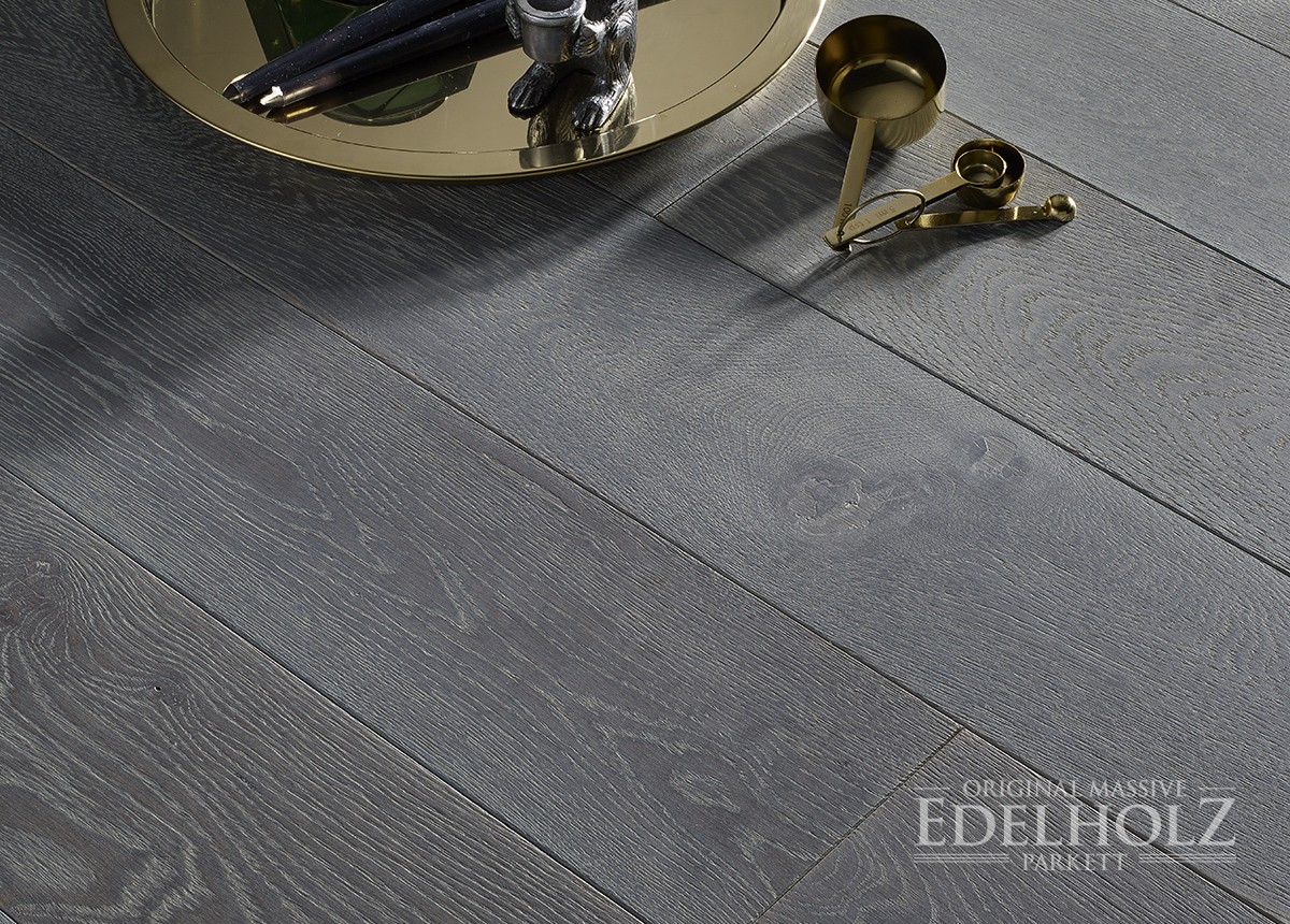 Diese elegante Diele ist fast so dunkel wie Anthrazit, ihre Textur bekommt aber dank der Lauge einen hellen grauen Farbton. Die Oberfläche wird leicht gebürstet um offene Poren zu erreichen. Dadurch werden die Kurven der Jahresringe weich fühlbar.