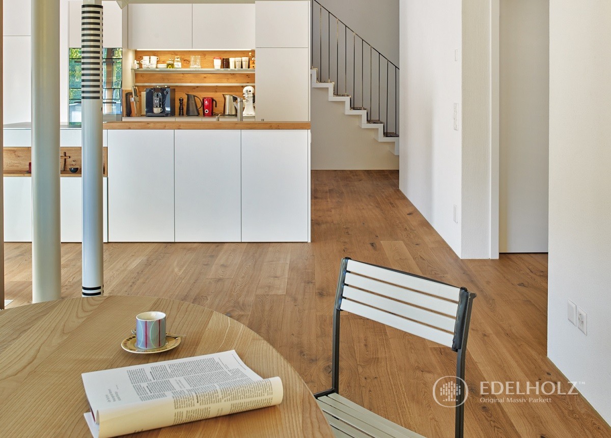 The surface of the Natural Wave flooring ripples like the water of a lake blew by the summer breeze. The sensitivity of the wooden floor, which incorporates the experience of tactility, is particularly evident in this concrete-coated house, as the brittle surfaces are perfectly counterbalanced by the delicate feel of the straight planks hand-planed by our master carpenters. Thanks to this special and traditional method, two identical wooden floor planks are never created. This is especially true if you choose Natural Wave flooring in rustic selection. Another special feature of the project is the staircase with modern geometry, which perfectly suits the design of the wooden floor. The stairs also represent the rustic selection, rich in knot-holes.