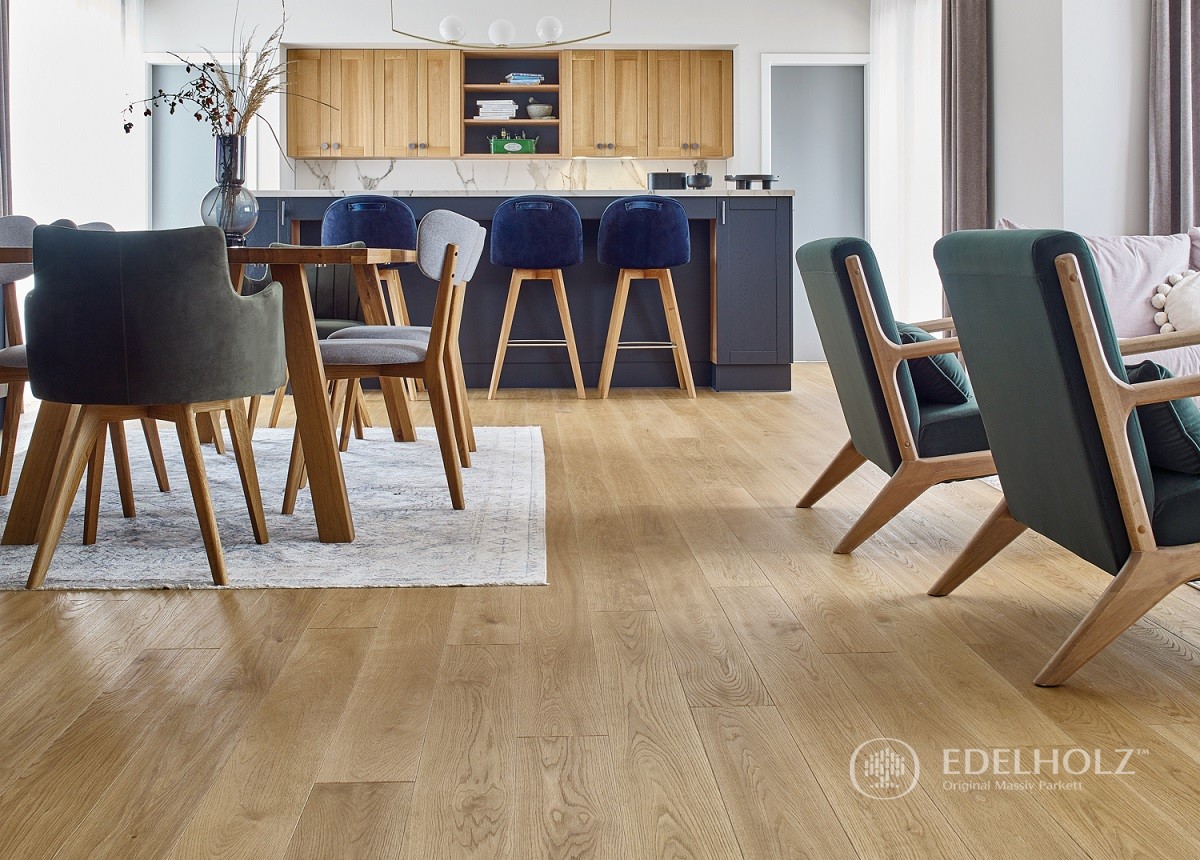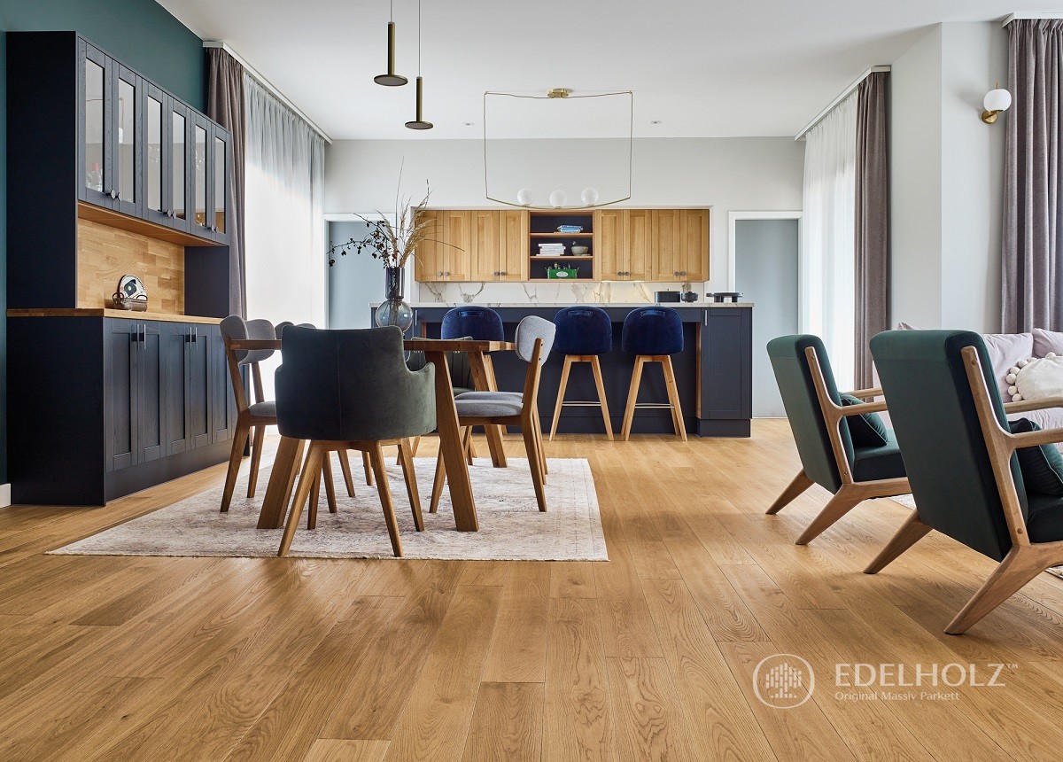 Our Natural Wave Limestone Nature flooring was placed in a home, rich in really contemporary, yet timeless design elements. The designers of the project approached the world of deep colours with courage and an extremely good taste, completed by fine-lined, modern and in some places retro-looking furniture. Wood surfaces, with which the Natural Wave design harmonizes perfectly, play a particularly important role in these interiors. The surface of Limestone Nature's oiled wood floor is structured, softly undulating, and offers a tactile experience in every detail. Our carpenters hand-plane every inch of it, thanks to which there are never two identical flooring planks.