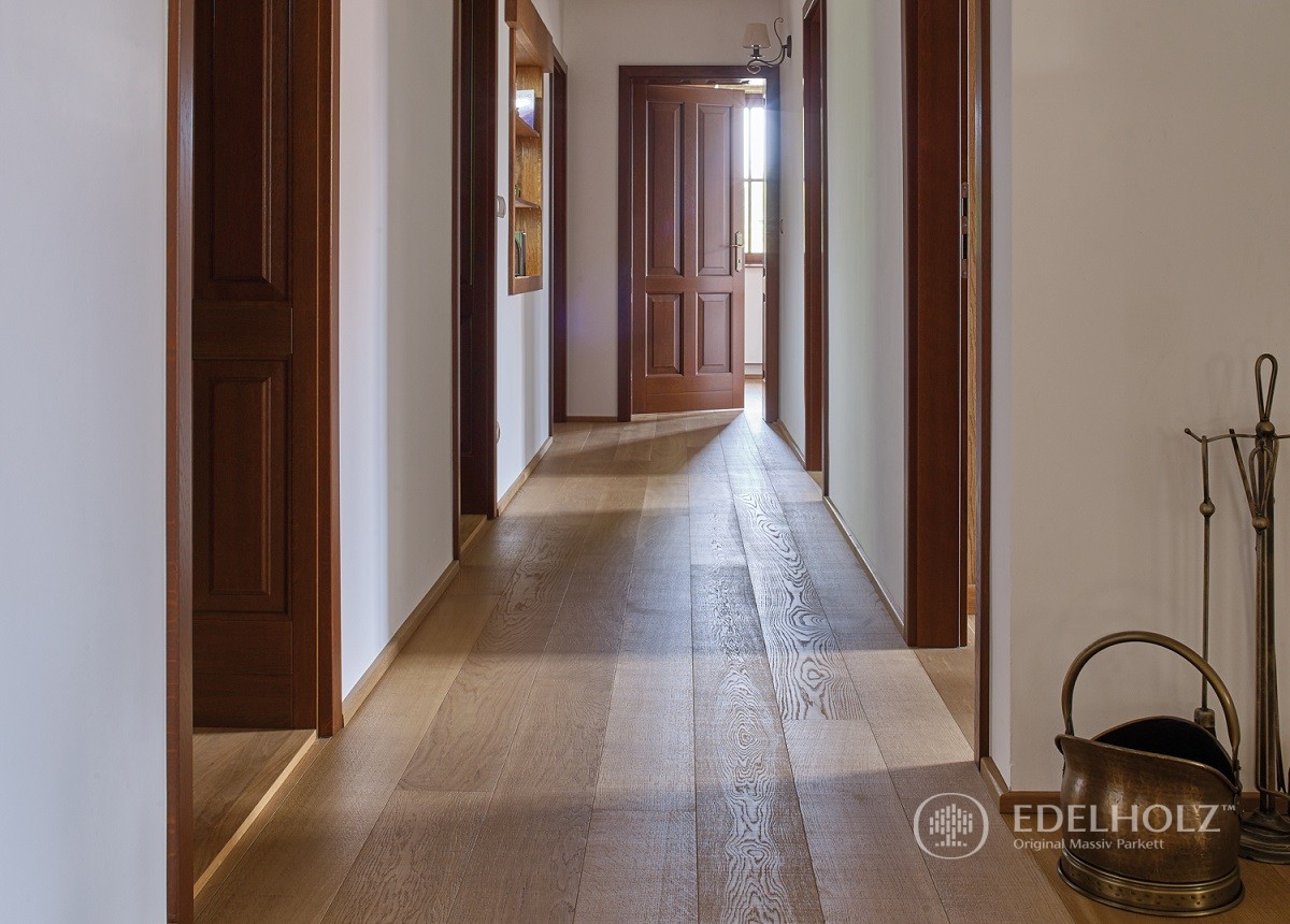 Our Origin 7000 flooring found its home in one of the most beautiful settlements on the northern shore of Lake Balaton as part of a special project. Rare is the kind of idyllic harmony that the designers have created in this holiday home, designed specifically in a classic-country style. Our Origin 7000 straight planks in these elegant yet homely spaces look as if they were always designed here. This natural, raw oak-looking wood flooring reflects both generous elegance and naturalness - as does the project as a whole. Its surface is enriched by subtle, almost imperceptible saw marks, which, in addition to the special tactile experience, provide a modern touch to the wooden floor. The raw freshness of the flooring is due to its untreated-looking, invisible surface treatment.