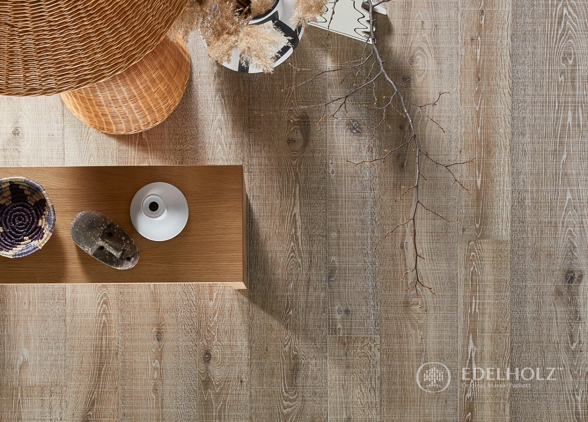 Una qualità molto apprezzata che colpisce per la sua naturale vivacità con nodi e crepe, che crea un aspetto superficiale emozionante, specialmente con le nostre plance di rovere di grande formato. Nodi piccoli e grandi, riparati con cura e qualche pezzo occasionale di alburno, combinati con texture di legno distintive e un vivace gioco di colori, creano una ricca diversità che è molto apprezzata dai clienti EDELHOLZ.