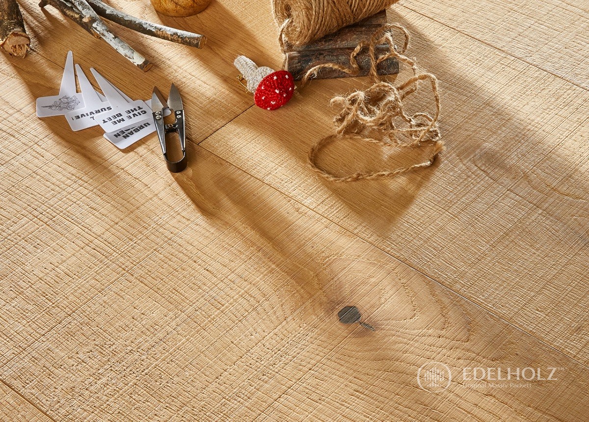 Una qualità molto apprezzata che colpisce per la sua naturale vivacità con nodi e crepe, che crea un aspetto superficiale emozionante, specialmente con le nostre plance di rovere di grande formato. Nodi piccoli e grandi, riparati con cura e qualche pezzo occasionale di alburno, combinati con texture di legno distintive e un vivace gioco di colori, creano una ricca diversità che è molto apprezzata dai clienti EDELHOLZ.
