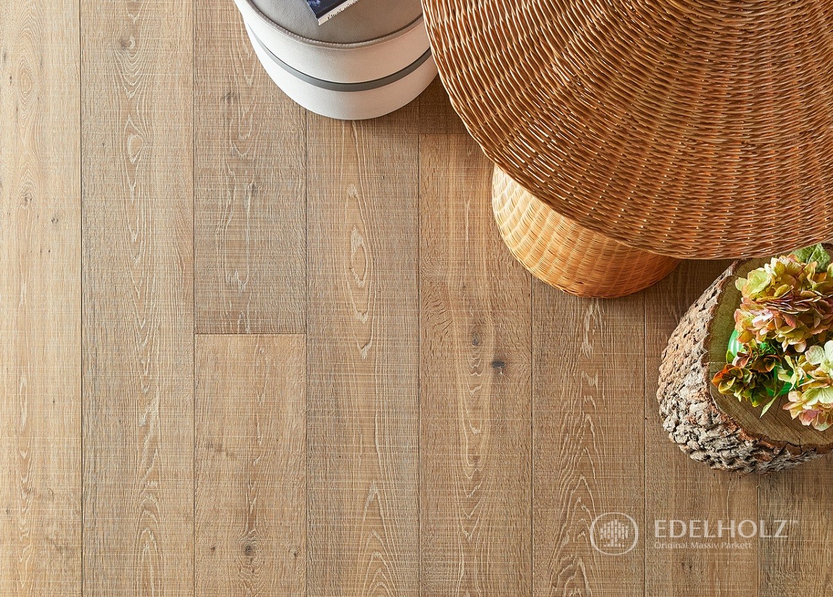 La superficie quasi priva di nodi della nostra qualità più pregiata, irradia eleganza e armonia . La venatura sottile e il motivo cromatico uniforme, esaltano ulteriormente questo effetto e lo rendono uno dei favoriti, in particolare per i pavimenti in parquet a spina di pesce EDELHOLZ.