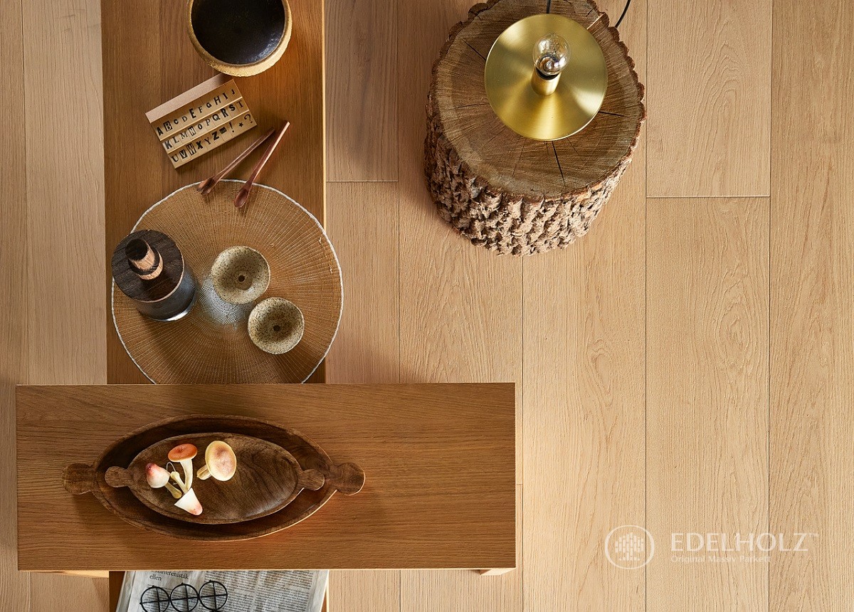 La superficie quasi priva di nodi della nostra qualità più pregiata, irradia eleganza e armonia . La venatura sottile e il motivo cromatico uniforme, esaltano ulteriormente questo effetto e lo rendono uno dei favoriti, in particolare per i pavimenti in parquet a spina di pesce EDELHOLZ.